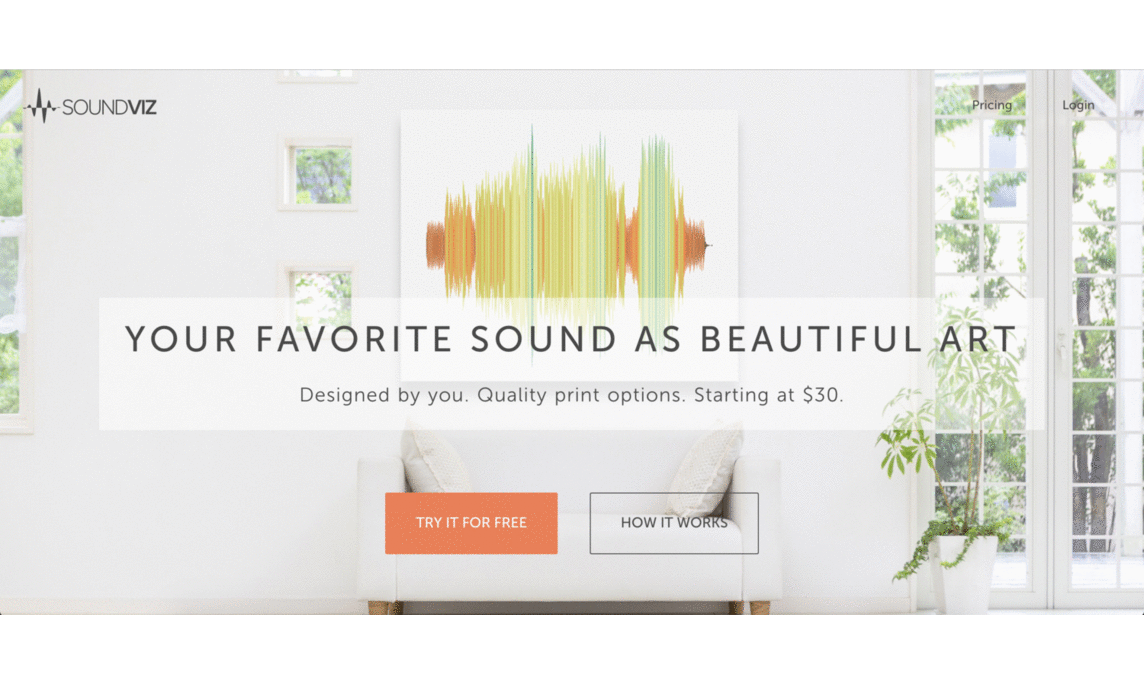 SoundViz is a product where you can turn your favorite sound into sound wave art. You start by uploading any audio file such as your favorite song or your significant other saying “I love you." After uploading the file, you have the option to customize the sound wave’s shape, color and text to make it your own. Finally, you can order a digital download to print yourself or SoundViz will print and mail you your artwork.
